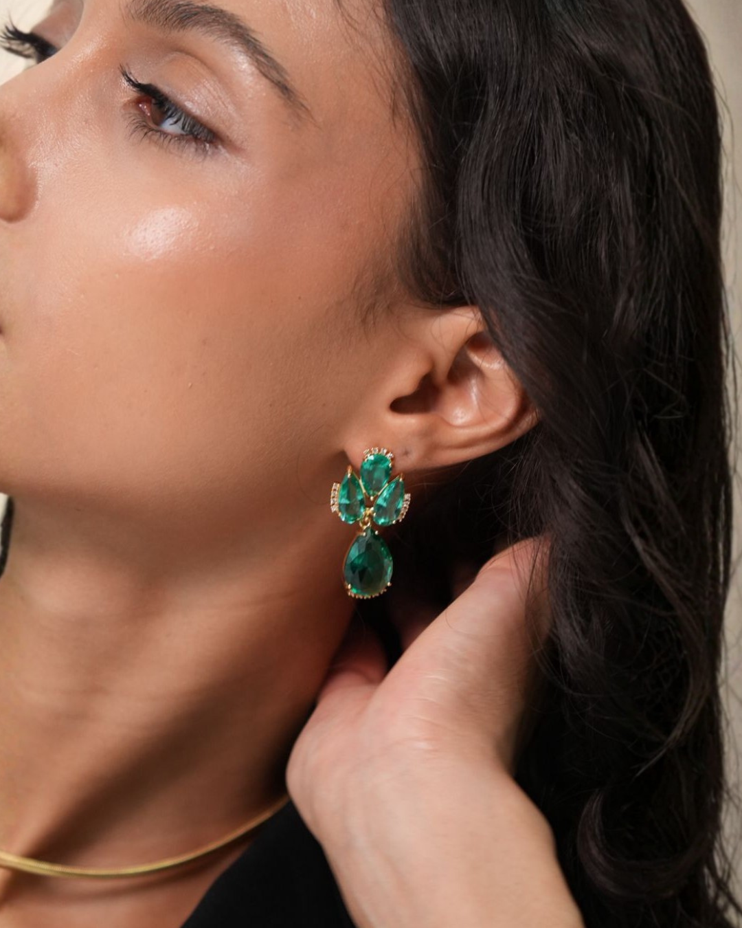 A composição é marcada por um trio de pedrarias em lapidação gota na base, adornados com delicadas microzircônias que trazem pontos de luz extras. O design evolui para uma gota pendente maior e articulada, que garante movimento e um brilho intenso a cada passo. O fundo com acabamento refinado garante que a peça seja leve, proporcionando conforto mesmo após horas de uso.