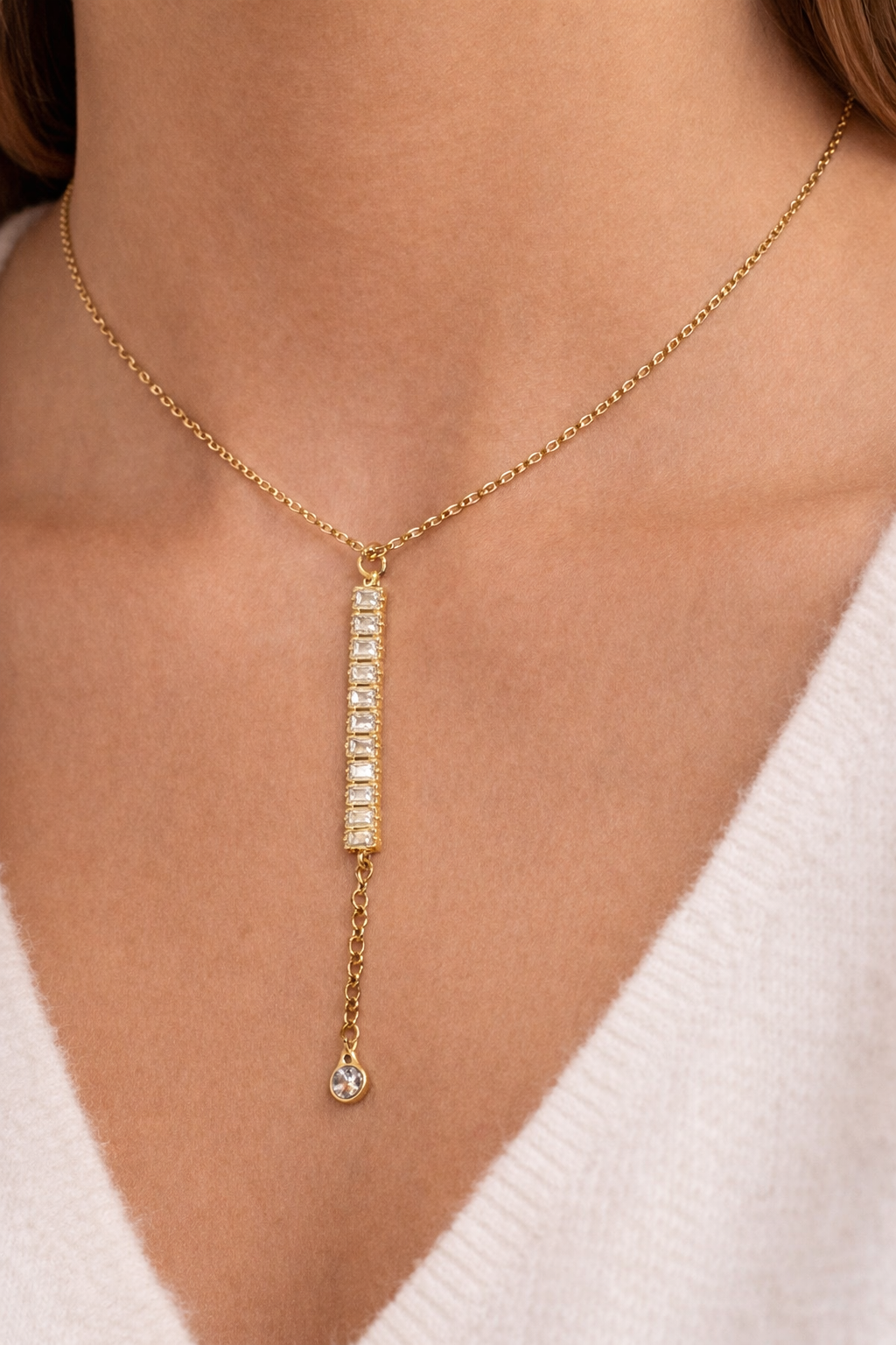 O colar apresenta corrente banhada a ouro e uma barra central cravejada de pedras que refletem a luz com intensidade, valorizando o visual. Sua composição permite que seja usado facilmente tanto em eventos sociais quanto no dia a dia para adicionar um toque de charme.