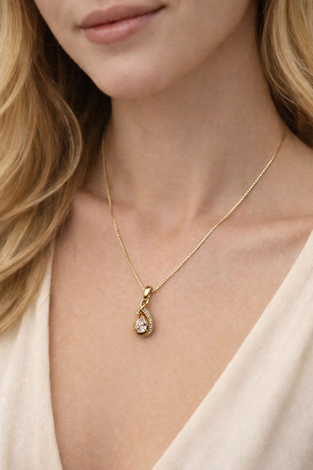 O pingente tem formato que envolve a pedra principal, criando um efeito de movimento elegante para valorizar o colo. Ideal para ocasiões especiais ou para quem quer um toque clássico com estilo contemporâneo.